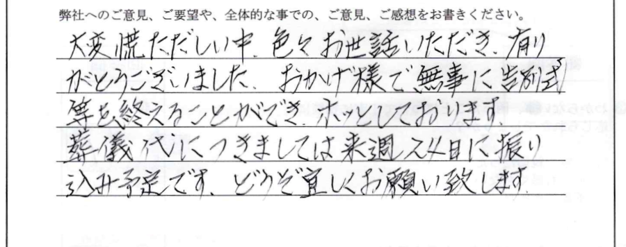 大変慌ただしい中色々お世話いただき、有難うございました。おかげ様で無事に告別式等を終えることができホッとしております。