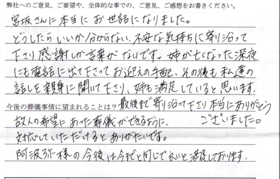 宮坂さんに本当にお世話になりました。どうしたら良いか分からない不安な気持ちに寄り添ってくださり感謝しか言葉がないです。姉が亡くなった深夜にも電話に出てくださってお迎えの手配、その後も私達の話を親身に聞いて下さり姉も満足していると思います。最後まで寄り添ってくださり本当にありがとうございました。