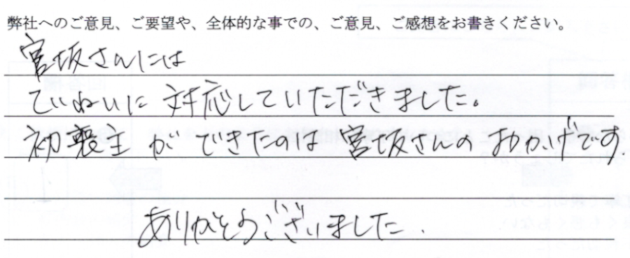 宮坂さんには丁寧に対応していただきました。初喪主が出来たのは宮坂さんのおかげです。ありがとうございました