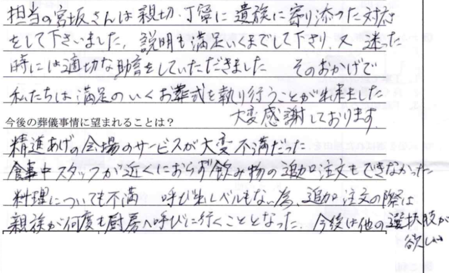 精進上げの会場のサービスが大変不満だった。食事中スタッフが近くにおらず飲み物の追加注文もできなかった。料理についても不満。呼び出しベルもない為追加注文の際は親族がなんども厨房へ呼びに行くこととなった。今後は他の選択肢も欲しい