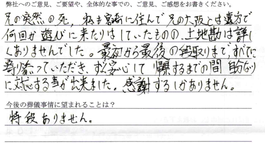 兄の突然の死、私も宮崎ニ寸で兄の大阪とは遠方で何回か遊びに来たりはしていたものの土地勘は詳しくありませんでした。最初から最後の段取りまで、全てに寄り添っていただき、すぐ安心して帰県するまでの間自分なりに対応することが出来ました。感謝するしかありません