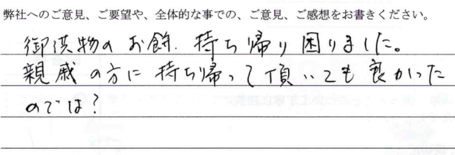 アンケートにて貴重なご意見をいただき、誠にありがとうございます。 御供物のお餅に関しまして、お持ち帰りの際にご不便をおかけしましたこと、深くお詫び申し上げます。ご葬儀の慌ただしい中、重さのあるお餅の扱いは大きなご負担であったと拝察いたします。 「ご親戚の方に分けてはどうか」という、大変貴重なご提案をありがとうございます。本来であれば、私共からそのようにご提案し、小分けの準備などをお手伝いすべきでございました。今後は、ご家族様のご負担を軽減できるよう、お配りする際のお声掛けや準備を徹底してまいる所存です。 至らぬ点をご指摘いただきましたこと、心より感謝申し上げます。